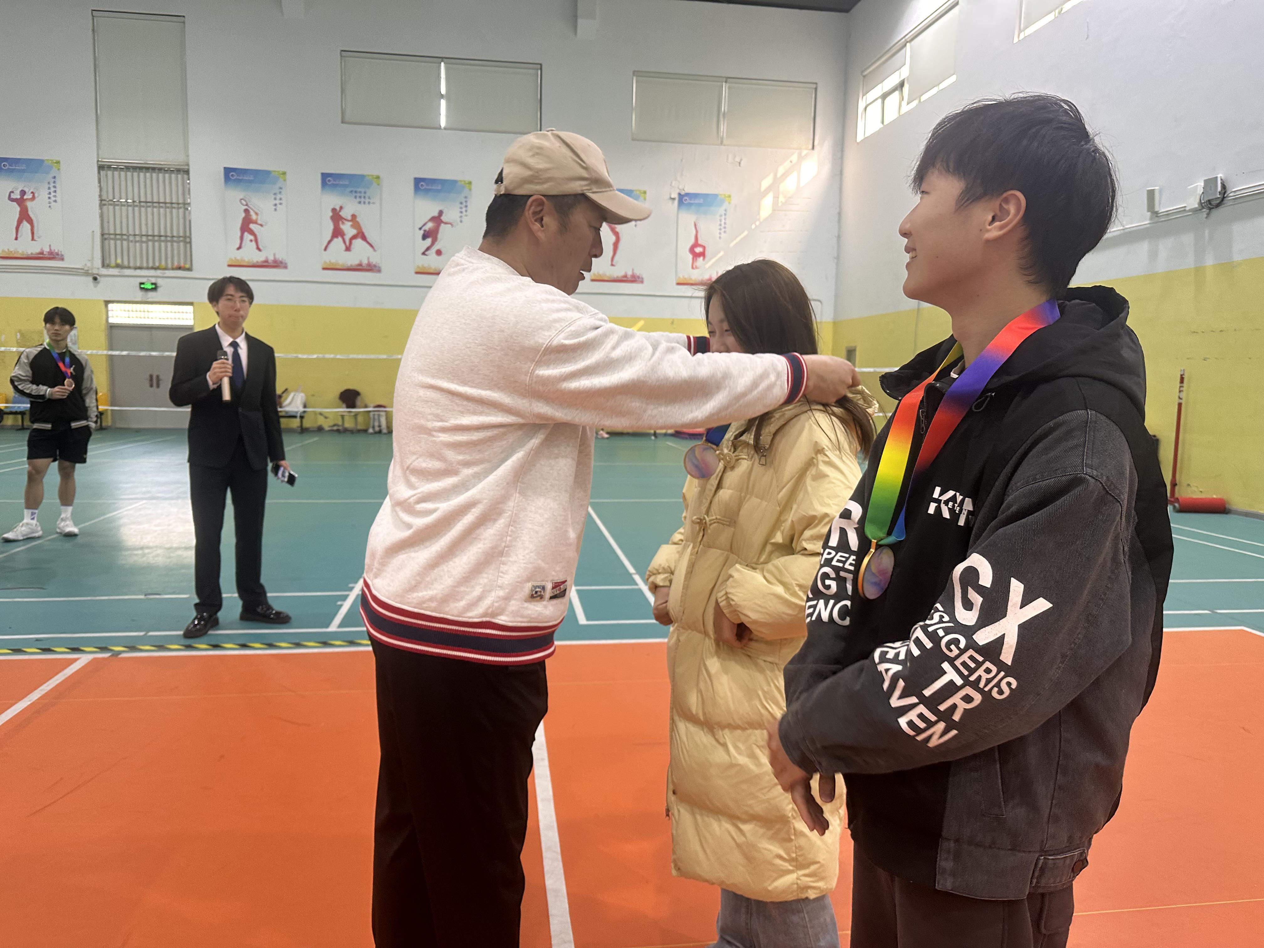 图为体育健康学院荣敦国院长为混双冠军颁奖